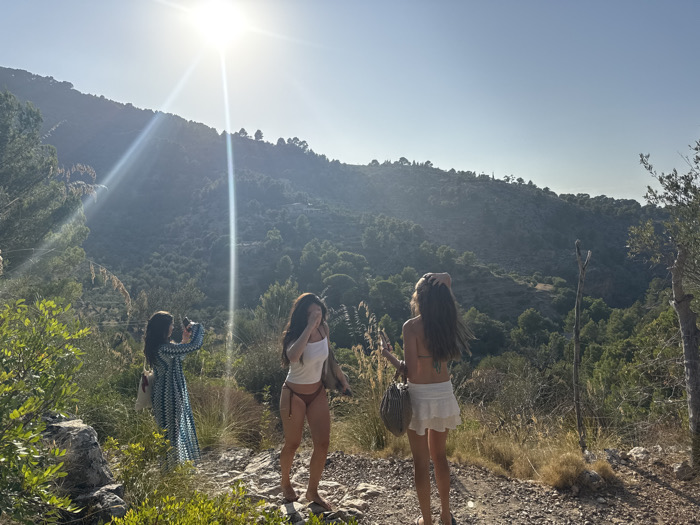The image depicts three females on a rocky, unpaved trail in a mountainous, heavily vegetated area of Deià, Spain, under bright sunlight. The intense sun, positioned high in the upper-center, produces a prominent lens flare. On the left, a female wearing a long, blue and white patterned dress is seen from behind, partially obscured by green foliage. She holds a dark handheld device to eye level, appearing to capture an image or video. In the center, a female in a white tank top and dark red bikini bottoms stands barefoot on the trail, her right hand raised to her face. On the right, a third female stands barefoot with her back to the viewer, dressed in a white skirt with lace trim and a dark bikini top. Her right hand is positioned at the back of her head, and she carries a woven bag in her left hand. The immediate foreground features rocks and green shrubbery. The midground and background consist of steep, tree-covered mountain slopes, with scattered distant structures visible on the hillsides. A thin, upright dead branch or stake is visible on the right side of the trail.