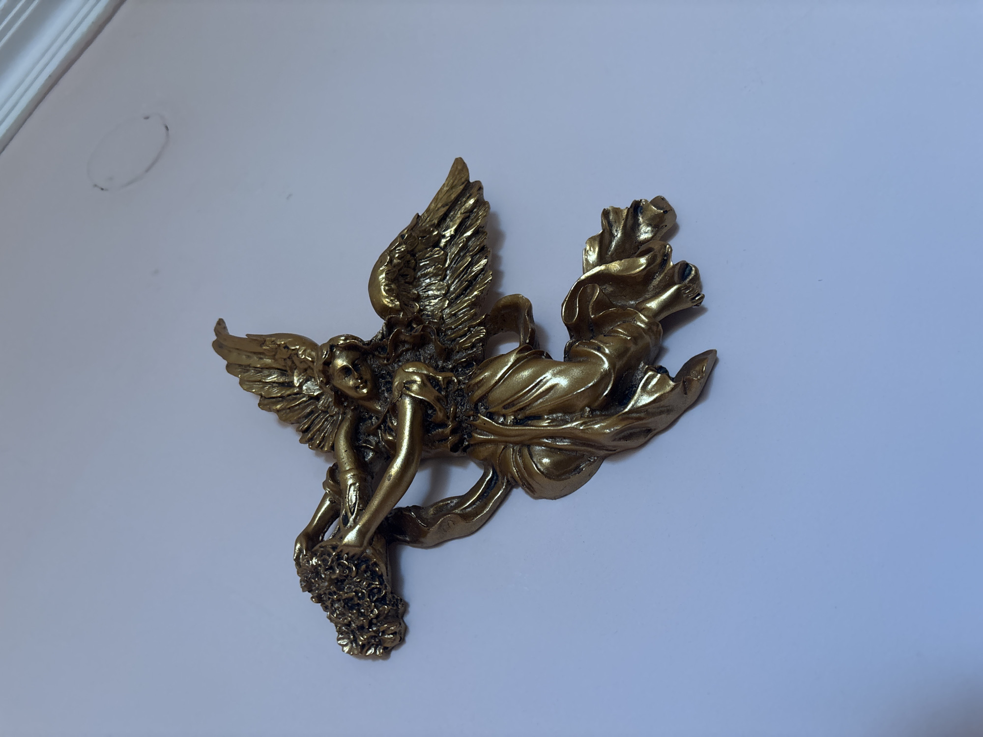 A golden-colored cherubic figure is affixed to a white wall. The figure appears to be in mid-flight or reclining, with intricately detailed wings, drapery, and a floral arrangement held in its hands. The lighting suggests a domestic, indoor setting. The image does not provide sufficient information to ascertain the location in Sofia, Bulgaria.