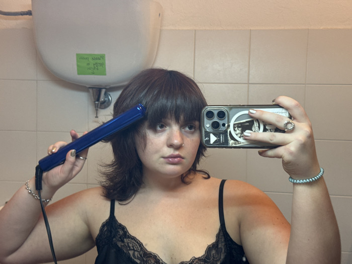 - "A woman in a black lace top holds a blue hair straightener to her bangs while taking a mirror selfie" by FM-IdNfF2, licensed under CC BY 4.0