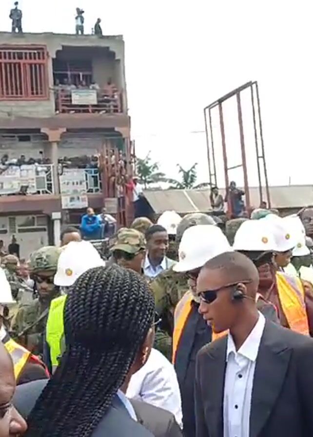 large crowd of people gathered in an urban area. Many of the individuals are wearing hard hats and military-style helmets. The presence of individuals in construction gear and military attire suggests a possible inspection or security operation. Several people can be seen standing on the roof of a building that has multiple floors, as well as on balconies. There are buildings on both sides of the crowd, banners, and a large truck behind the crowd. Some members of the crowd are holding cameras and taking photos.