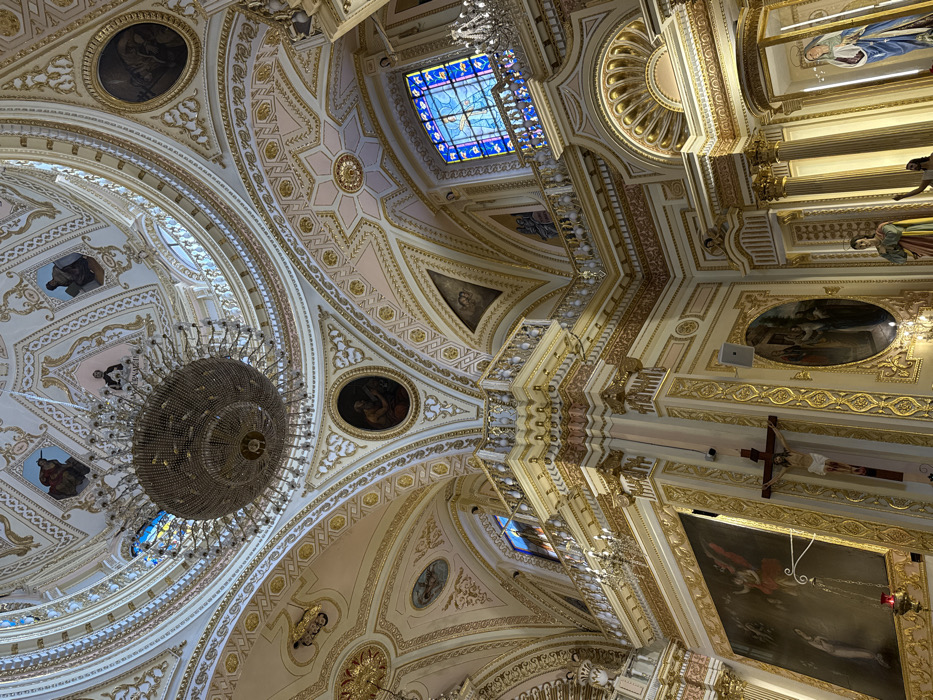 The elaborate ceiling of a church displays intricate architectural details, including arched patterns, ornate gold trim, and embedded circular paintings. A large chandelier hangs prominently, casting shadows across the ceiling. Stained glass windows provide light. Walls feature paintings framed in gold, along with a crucifix. The interior is a lavish display of religious art and architecture.