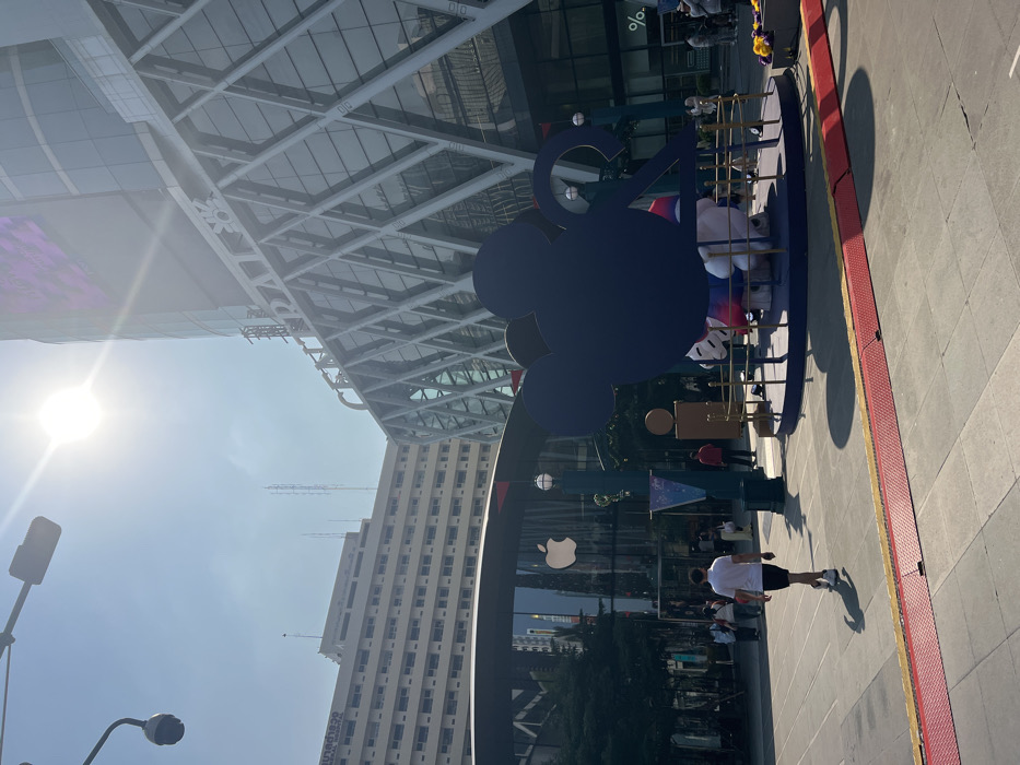 n outdoor scene with a large Mickey Mouse sculpture in front of a glass building with the Apple logo. A walkway with red trim runs alongside the sculpture. People are walking and standing near the sculpture and building. In the background, a tall, light-colored building with multiple windows is visible. Above, a modern, geometric glass structure frames the sky, with the sun shining brightly.