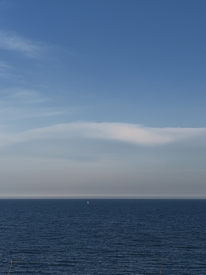 This image depicts a coastal view of the Black Sea from the city of Burgas, Bulgaria, likely taken from an elevated position such as the Sea Garden. The scene is dominated by a vast expanse of water and sky. The sky occupies the upper two-thirds of the frame, transitioning from a clear, medium blue at the zenith to a lighter, slightly hazy blue-grey approaching the horizon. A prominent, elongated white cloud formation stretches horizontally across the mid-sky. A small, dark avian object is visible in flight in the upper-left quadrant of the sky. The horizon line is sharp and flat, separating the sky from the sea. The Black Sea occupies the lower third of the image, presenting a deep blue color with subtle ripples across its surface. A single, small white sailboat is visible in the distant water, positioned slightly to the left of the image's vertical centerline. The immediate foreground at the bottom edge displays minimal, out-of-focus dark vegetation, indicating the viewpoint's elevation. No human subjects are visible.