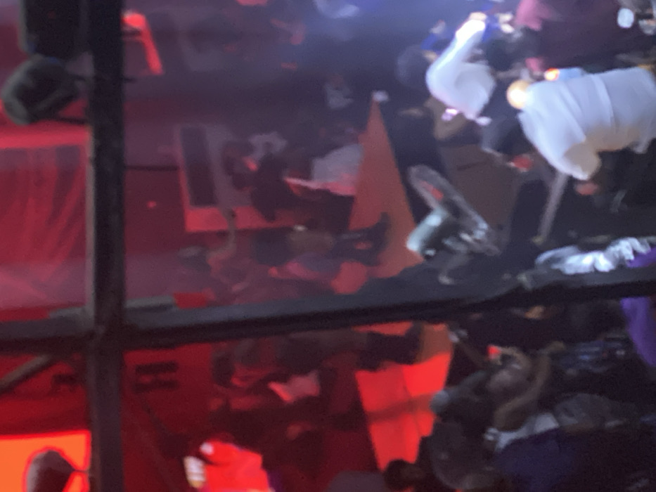 A blurry, overhead shot captures a dimly lit interior space. Tables and chairs are scattered, with people seated or standing around them. An orange traffic cone is partially visible. The lighting shifts between red and pale tones, creating an indistinct atmosphere. A grid-like structure, possibly a window frame, is in the foreground.