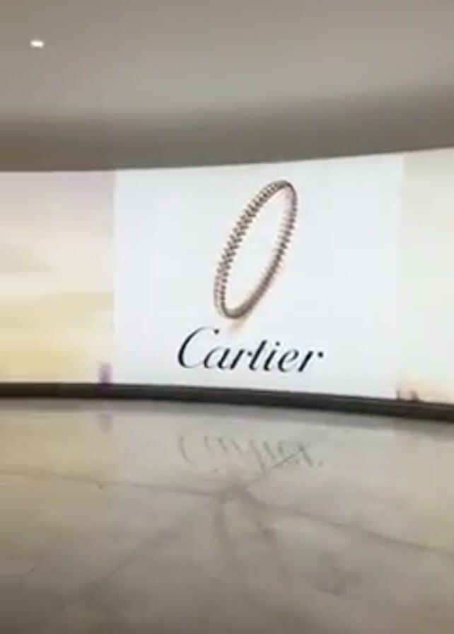 A man wearing all black with a black backpack walks through a well-lit, modern-looking hallway. The hallway has a curved wall with a large Cartier ad featuring a leopard. Further down the hallway are several backlit pictures of Paris. The floor is a shiny light gray.
