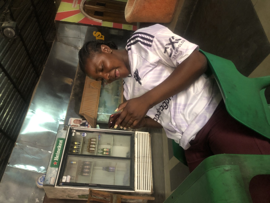 - "An indoor scene in Jos, Nigeria, features a young Black female seated at a green plastic table, facing slightly right and looking down at a smartphone held in both hands" by FM-EUvcD2, licensed under CC BY 4.0