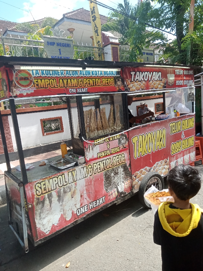 - "red and white mobile food cart positioned on a paved surface in Nganjuk, Indonesia, identifiable by a sign on a fence in the background that reads "SMP NEGERI 1 NGANJUK"" by FM-ZmuuT2, licensed under CC BY 4.0