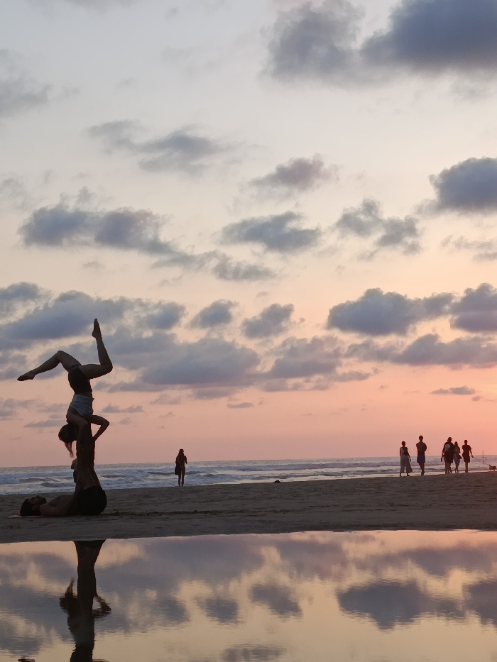 The image depicts a coastal scene in Kathaluwa, Sri Lanka, at either sunrise or sunset. The sky displays a gradient of light blue, lavender, and orange-pink, with scattered stratocumulus clouds. A still, reflective pool of water in the foreground mirrors the sky and subjects. On the left side of the sandy beach, two individuals are engaged in acroyoga. A prone individual on a mat serves as the base, supporting a second individual in an inverted handstand with extended, separated legs. Both are silhouetted, and their reflections are visible in the foreground water. Further along the shoreline, a single silhouetted individual stands near the ocean. To the right, a group of five to six silhouetted individuals walks along the water's edge, moving generally leftward. The ocean exhibits low-amplitude waves breaking at the shoreline.