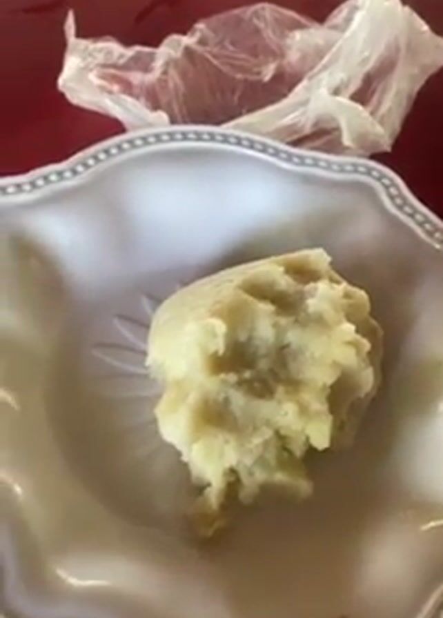 A man is preparing to eat a traditional meal on a red table. In a white scalloped plate, there is a mound of fufu, a starchy food. Adjacent to the fufu are two colorful bowls. One bowl is pink with a dark red sauce and some floating bits, and the man dips his hand into this bowl. The other bowl is pink and black and contains chunks of food. A plastic bag and a glass bottle of Coca-Cola are also visible on the table. The setting appears to be outdoors or in a partially enclosed space.