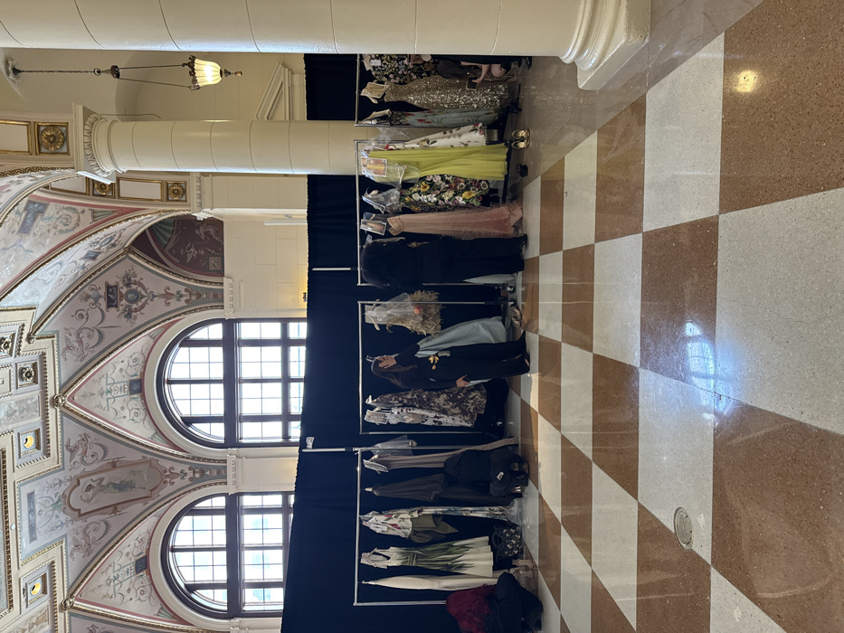 A brightly lit interior space showcases a row of clothing racks laden with dresses. The garments range in style and color, displayed against a dark backdrop. Elegant architecture is visible, including arched windows, ornate ceiling details, and a large column. The floor is a checkered pattern of tan and white. A person is standing by the racks, potentially photographing or inspecting the clothing. The overall setting suggests a backstage or pre-event arrangement within a sophisticated building.