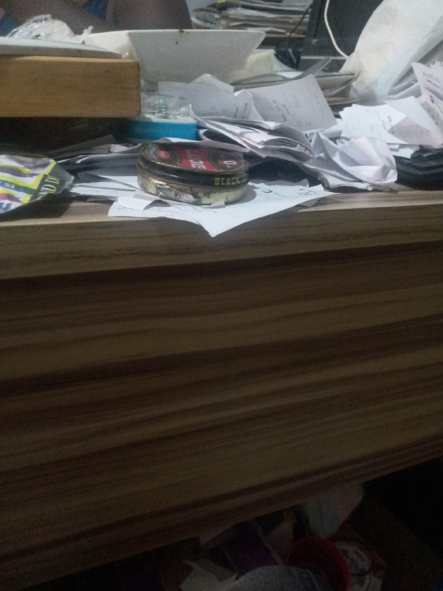 cluttered wooden desk. The desk is covered in papers, a bowl, and other objects. A tin of black shoe polish is prominently featured in the foreground. The scene is poorly lit and appears to be indoors. There is no explicit information indicating the location as Asaba, Nigeria.