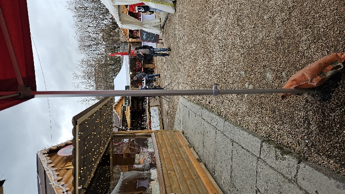 This image depicts an outdoor market scene in Le Puy-en-Velay, France, under an overcast, gray sky. In the immediate foreground on the right, a gray vertical support pole, part of a red overhead canopy structure, is anchored at its base by an orange sandbag resting on a bed of small, light brown gravel. To the left of the pole, a paved walkway of gray concrete slabs runs alongside a wooden market stall. This stall features a slatted wooden facade and glass display windows, illuminated by strings of warm white lights. Its roofline is adorned with a white, scalloped decorative trim. Various packaged items are visible within the stall's display. The gravel surface extends across the mid-ground, where several individuals are present. One man, wearing a red hat and dark jacket, walks towards the camera holding a beverage in a cup. Further back, additional market structures include multiple wooden stalls and white tents. A red and white flag, specifically depicting the Swiss flag, is visible flying from a pole behind a stall. Another person wearing a red hat and a red and white jacket is partially visible near a white tent on the far right. In the distant background, leafless deciduous trees cover an elevated slope, and some white accumulation is visible on distant structures under the uniformly gray sky.