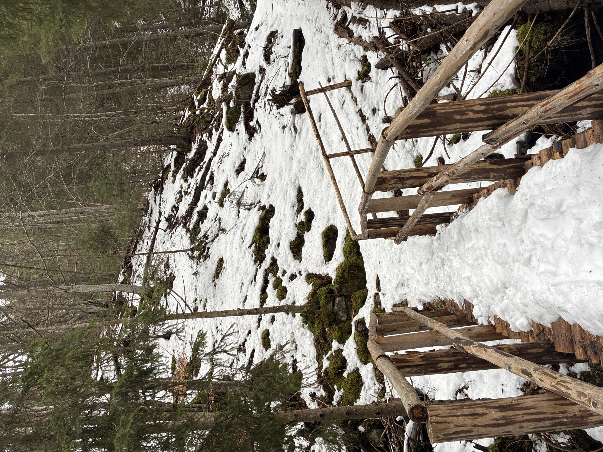 The image depicts a snowy, wooded area with a rustic wooden staircase running through it