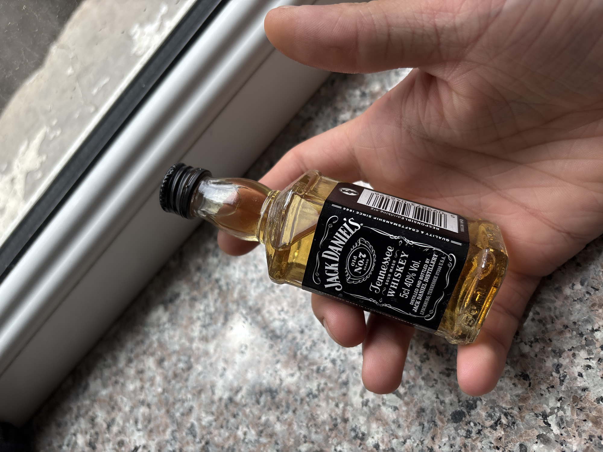 A person's right hand is holding a miniature bottle of Jack Daniel's Tennessee Whiskey. The bottle is mostly full. The background consists of a white window frame and a grey countertop with a speckled pattern. The label on the bottle is visible, showing the brand name and details about the whiskey, including its volume and alcohol content.