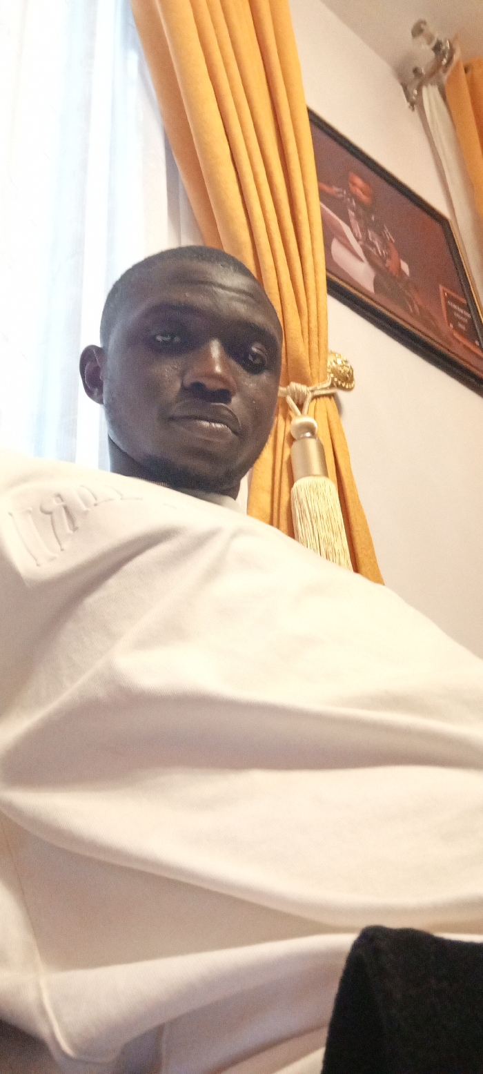 The image displays a dark-complexioned adult male, visible from the upper chest upwards, positioned centrally and looking directly into the camera