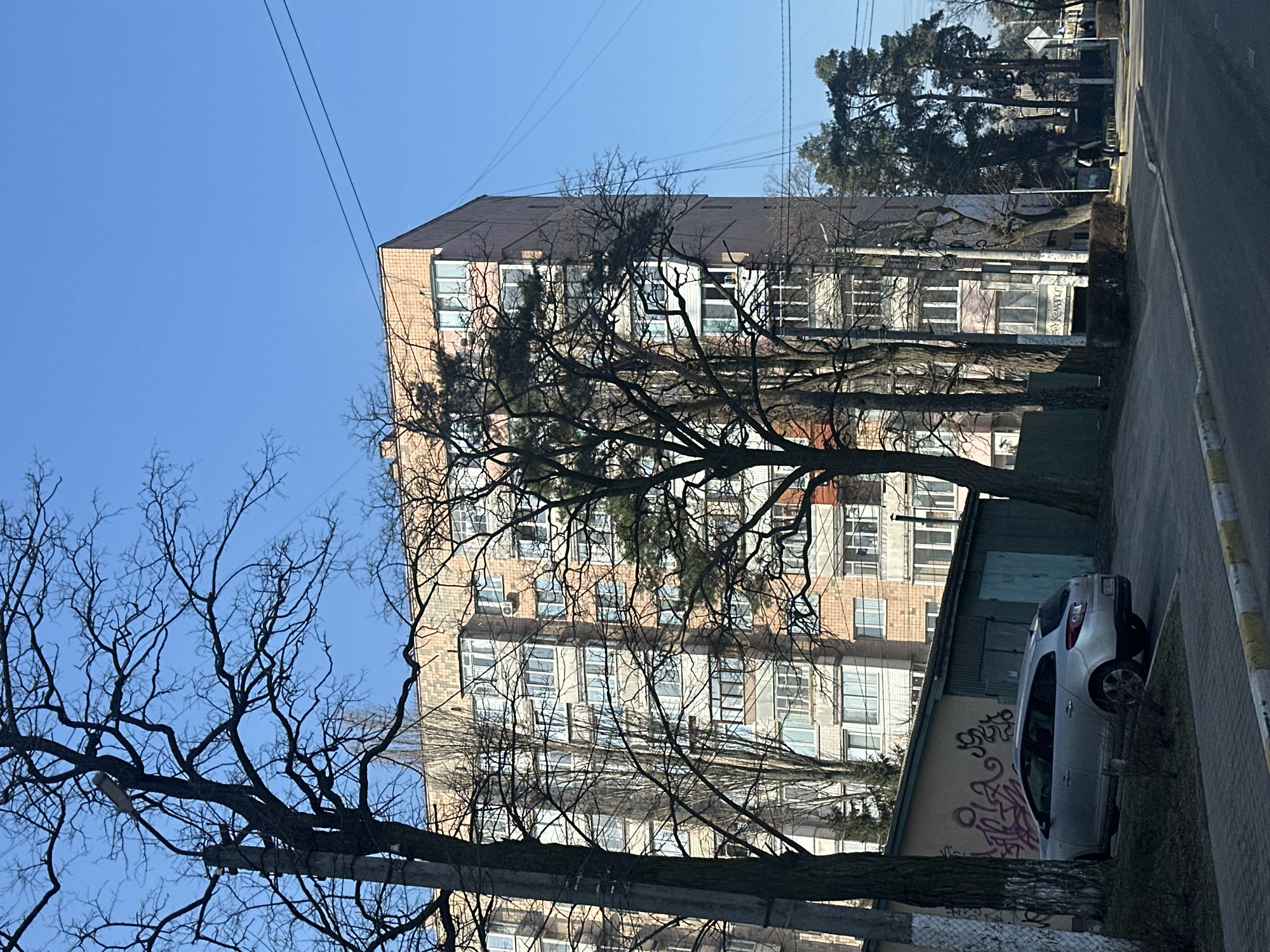 The image captures an urban street scene in Irpin, Ukraine, under a clear blue sky. A multi-story residential building, approximately eight stories tall, occupies the central and background, featuring a facade primarily composed of light brick and contrasting lighter sections around numerous windows and enclosed balconies. The top floor exhibits a patterned brick design. In the foreground, on the left, a utility pole stands vertically, partially obscured by bare deciduous trees with extensive branch networks. One tree trunk near the left edge displays white and dark banding. To the lower left, a silver hatchback vehicle is parked on unpaved ground adjacent to a low, single-story building with a slanted roof. This structure's light-colored wall features purple and black graffiti, and its right side includes two green, possibly metallic, garage doors. A paved street, bordered by a curb painted with white and yellow stripes, extends across the lower portion of the frame. A paved sidewalk parallels the street. Further down the street on the right, additional trees, including conifers, line the thoroughfare. Another utility pole with multiple black wires is visible in the mid-distance on the right. A single individual, dressed in dark attire, is observed walking away from the camera on the sidewalk in the distance on the right side of the street. The bare trees suggest a late autumn or winter setting.