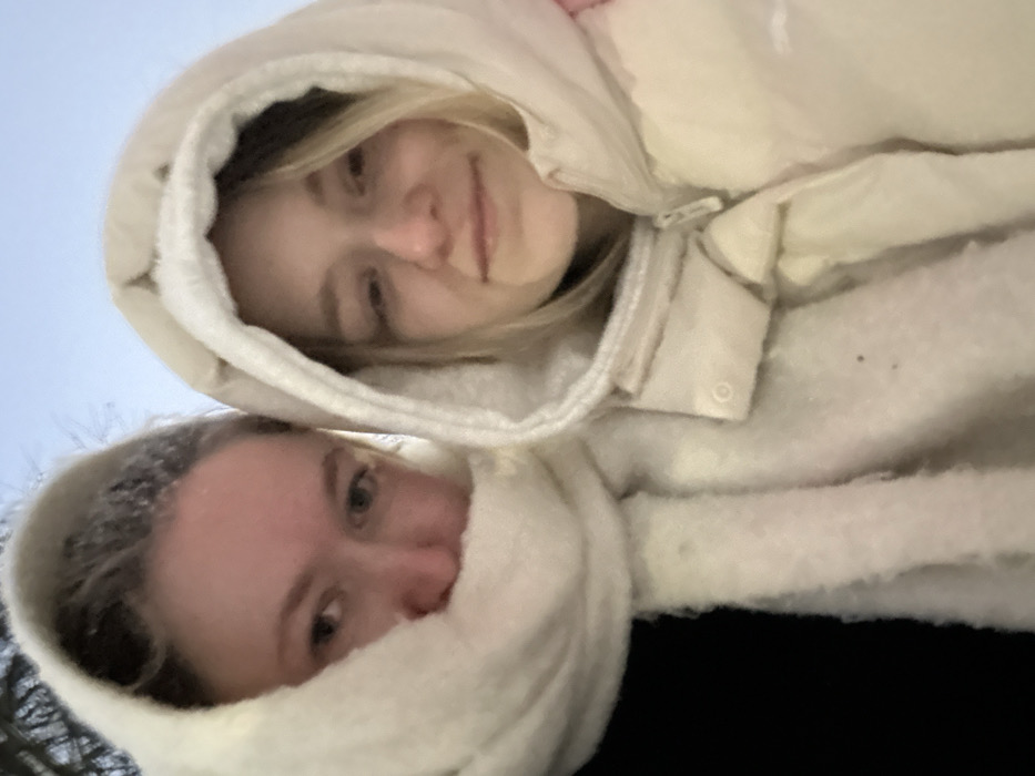 The image displays two young adult females in a close-up, likely self-taken, photograph set outdoors in Vologda, Russia. The individual positioned on the left has her head and lower face enveloped in a voluminous, light-colored, possibly white or cream-colored, textured scarf or shawl, exposing only her eyes and forehead. Minute white particles, consistent with snow or frost, are visible on her hair above her forehead. A dark-colored garment is visible beneath the scarf. The individual on the right wears a cream or beige hooded puffer jacket, with the hood pulled up to frame her face and revealing a light-colored fleece lining. She has blonde hair and exhibits a subtle upward curve at the corners of her lips. The background is blurred and appears as a uniform light blue-grey, indicative of an outdoor, possibly overcast or twilight, winter environment.