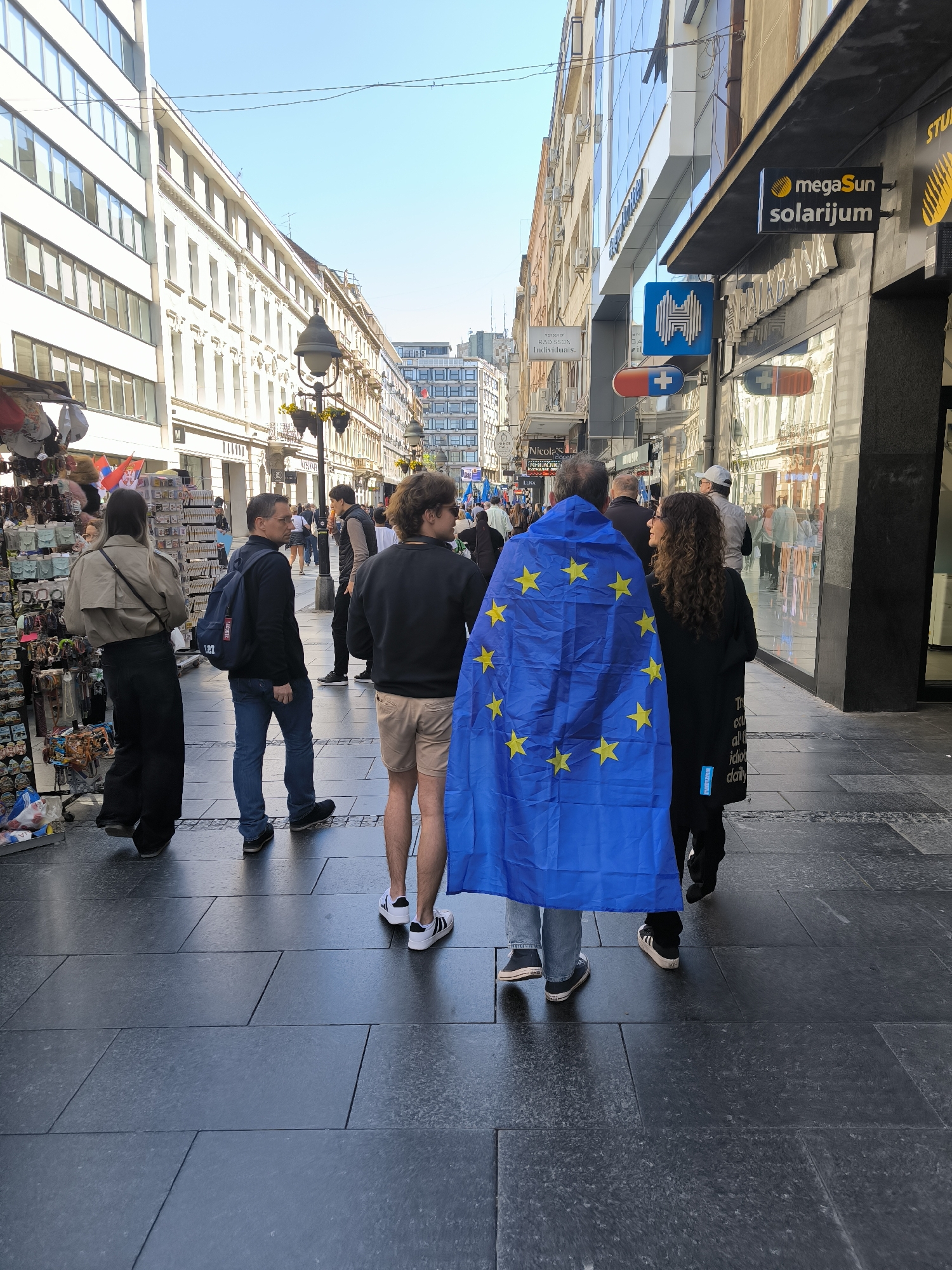 Captured at street level in Belgrade, Serbia, the image presents a diverse array of elements within an urban setting. The foreground is dominated by a group of people. Prominently featured in this cluster is an individual draped in the flag of the European Union, their back to the viewer. Positioned near this individual is a woman with curly hair and wearing a black coat. Other people, including a man in a black jacket and jeans carrying a backpack, are also visible. The scene unfolds on a paved city street lined with buildings. On the right of the shot, signs for "megaSun solarium" and a pharmacy are visible. On the left, a street vendor's stand is set up. In the distance, more people stroll down the street, which is framed by buildings of various heights and architectural styles.