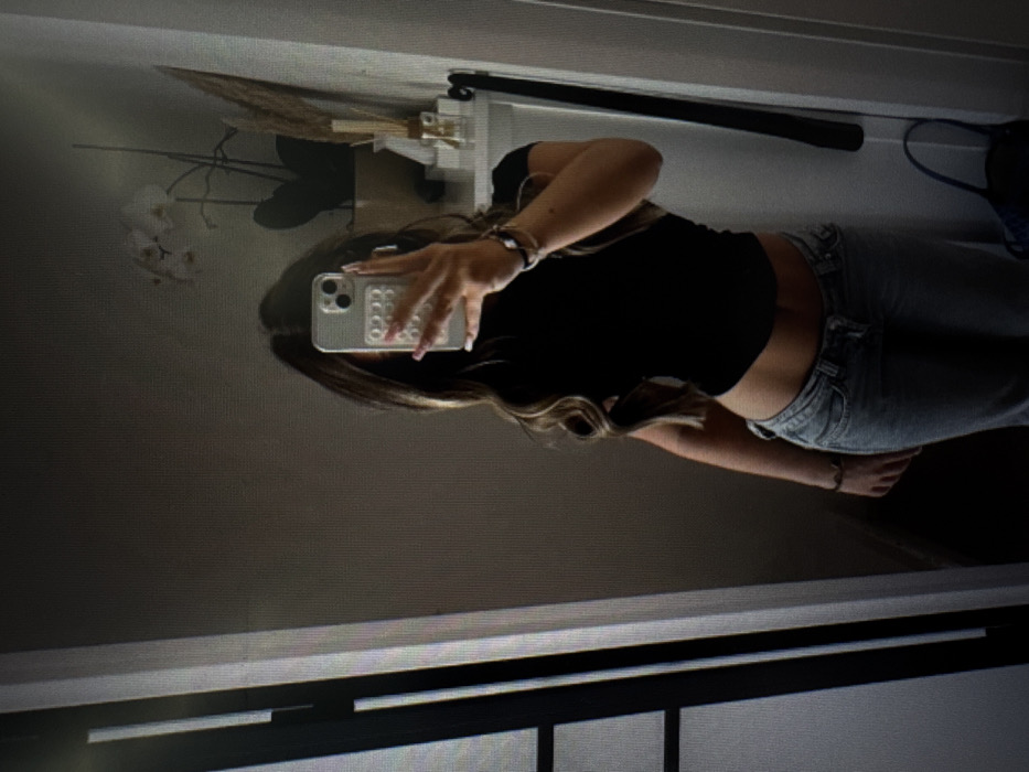 A female individual is observed taking a mirror selfie indoors in the city of Oltiariq, Uzbekistan. The subject, positioned centrally, has long, wavy, dark brown hair with lighter highlights and is wearing a black, short-sleeved cropped top and light-wash blue jeans, exposing her midriff. Her right hand holds a light-colored smartphone with a textured case, partially obscuring her face as she photographs her reflection. Her right hand displays manicured fingernails with light polish, and her left wrist features a dark bracelet. The mirror's reflection reveals a cream or light-colored wall. To the right of the subject, a white shelf is visible, adorned with a potted white orchid, a vase containing dried reeds or grasses, and a small decorative clear bottle. A dark-colored bag or purse rests on the floor to the bottom right. To the left, a dark vertical frame, possibly part of a door or window, and an adjacent white vertical structure are reflected. The lighting appears subdued.
