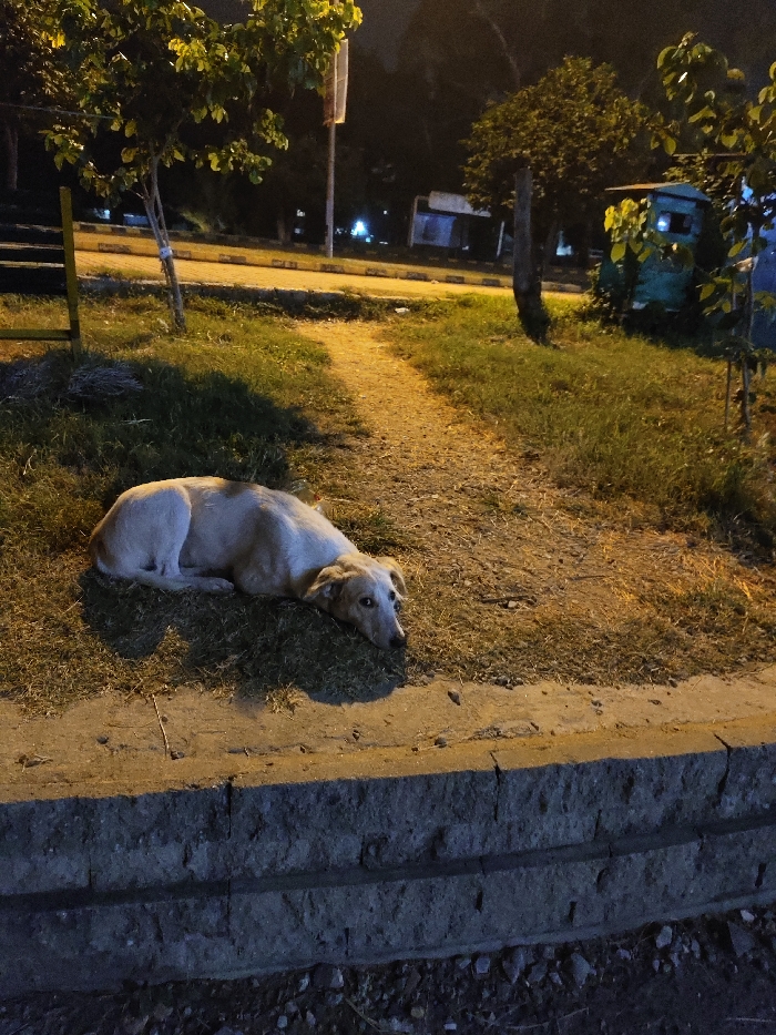 The image depicts a light-colored adult dog, predominantly white with tan markings on its back and head, resting on its left side on a patch of grass. Its head is lowered and turned towards the right, with its eyes open and directed towards the camera. The dog is positioned in the lower-left to central portion of the frame. Adjacent to the dog, a narrow dirt or gravel path meanders into the background, illuminated by an unseen artificial light source that casts a warm, yellowish glow on the path and portions of the grass. In the immediate foreground, a low, grey concrete retaining wall or curb spans the width of the image. Beyond the path, a paved road with a light-colored curb is visible, running horizontally across the mid-ground. The scene is set at night, indicated by the dark sky and artificial illumination creating distinct shadows from trees and the dog. In the background, several trees with visible foliage are present, alongside indistinct outlines of urban structures. One identifiable object on the far right, beyond the road, is a small, light-blue or greenish utility box or shed. The environment is consistent with an urban park or roadside green area in Islamabad, Pakistan. No human subjects or active interactions are depicted.