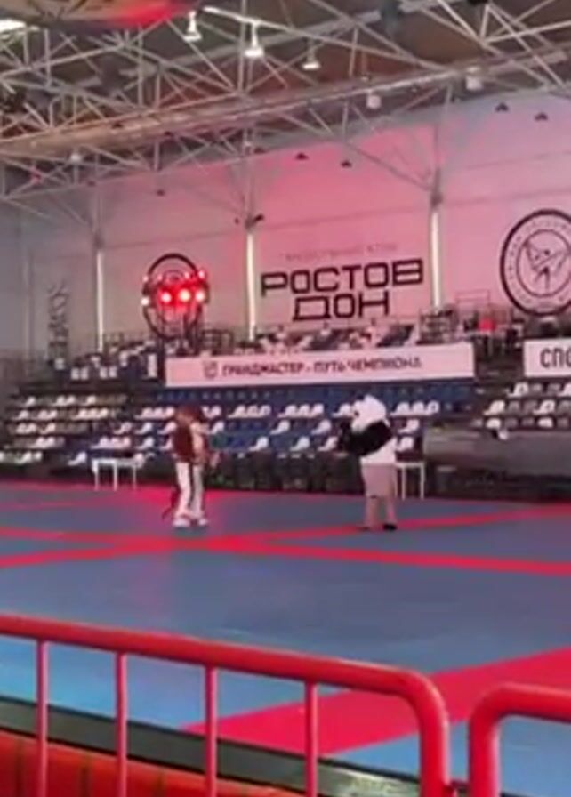 two mascots fighting on a blue and red mat in a large arena. On the left is a mascot dressed in white martial arts clothes with a tiger head. On the right is a panda mascot wearing grey shorts and a t-shirt. They are both facing each other, and they start a play fight. The arena has rows of empty seats in blue and white. Behind them is a large white sign that says "ГАДБОЛЬНЫЙ КЛУБ РОСТОВ-ДОН" and "ГРАНДМАСТЕР - ПУТЬ ЧЕМПИОНА". Overhead is a large electronic scoreboard. A red safety railing is between the camera and the fight.