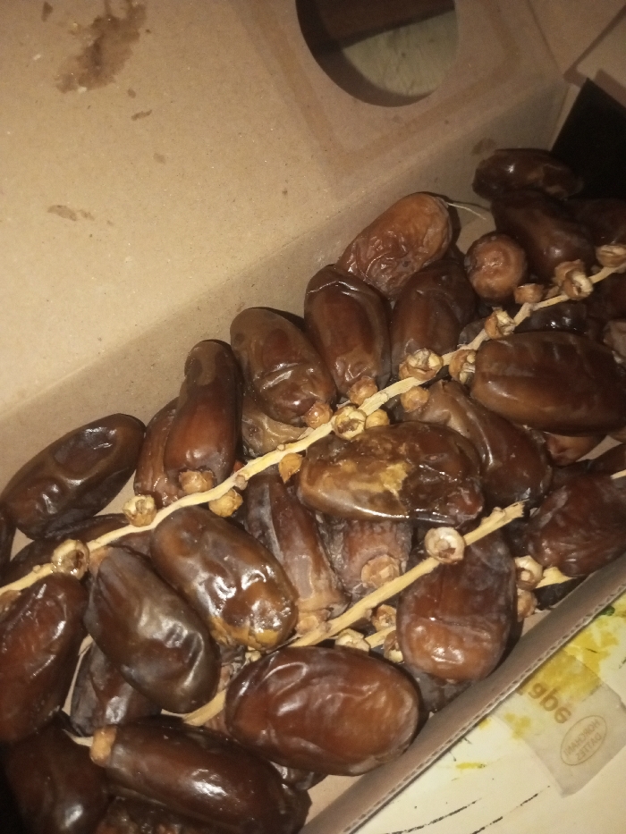 - "The image depicts an open, light-brown cardboard box containing a large quantity of dark brown dates" by FM-0uStW2, licensed under CC BY 4.0