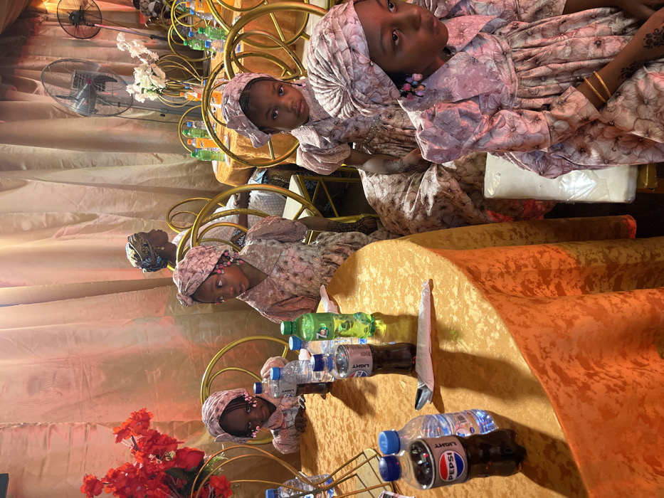Several young girls in matching dresses and head coverings sit in gold chairs at a wedding reception. An orange and gold draped table hosts an assortment of bottled drinks and napkins. Red flowers and a fan are visible in the background. The girls seem to be observing something outside the frame.