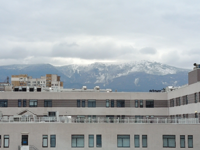 The image displays an urban scene in Sofia, Bulgaria, set against a backdrop of snow-capped mountains under an overcast sky. A light beige, multi-story building dominates the foreground, featuring numerous dark-paned rectangular windows across its visible levels. A horizontal striped brown section is present on one of the upper levels. A white metal railing system delineates a flat roof area or terrace on the building's lower section. On the upper right portion of the foreground building's roof, a partial blue sign with white letters "atnm" is visible, along with a dark, cylindrical object. In the midground, to the left, several older, multi-story residential blocks with light beige and grey facades are visible. The background is dominated by a snow-covered mountain range, identifiable as Vitosha Mountain, with its peaks partially obscured by a low, dense layer of grey clouds. The sky above is entirely overcast. No individuals or specific actions are depicted.