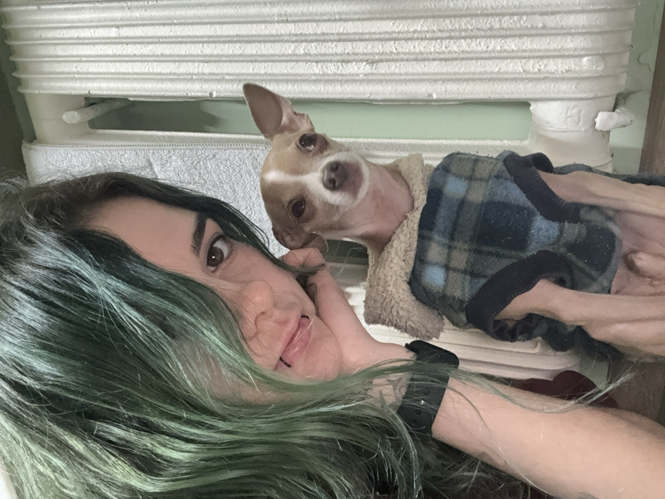 A woman with green-tinted hair poses for a selfie with her pet chihuahua. The dog wears a plaid, sherpa-lined vest. They are lying in front of a radiator. The woman's hand is near her face, and she is wearing a black wristwatch. The dog is looking at the camera with a curious expression. The overall lighting is soft, and the background is slightly blurred.