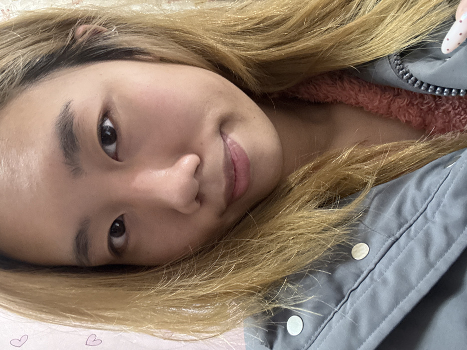 An East Asian female is depicted in a close-up portrait, positioned indoors within the city of Shapingba District, China. She gazes directly at the viewer with a slight, closed-mouth smile. Her long, wavy hair is dyed a golden blonde or light brown and frames her face. She wears a light grey or blue-grey jacket featuring silver-colored snap buttons along the front placket. Beneath this, a collar or inner layer of a coral-pink or peach-colored fluffy garment is visible. The background is a plain, light-colored wall, with two faint pink heart-shaped graphics visible in the upper left corner. A fingernail, painted light pink with white polka dots, is partially visible on the lower right side of the image.