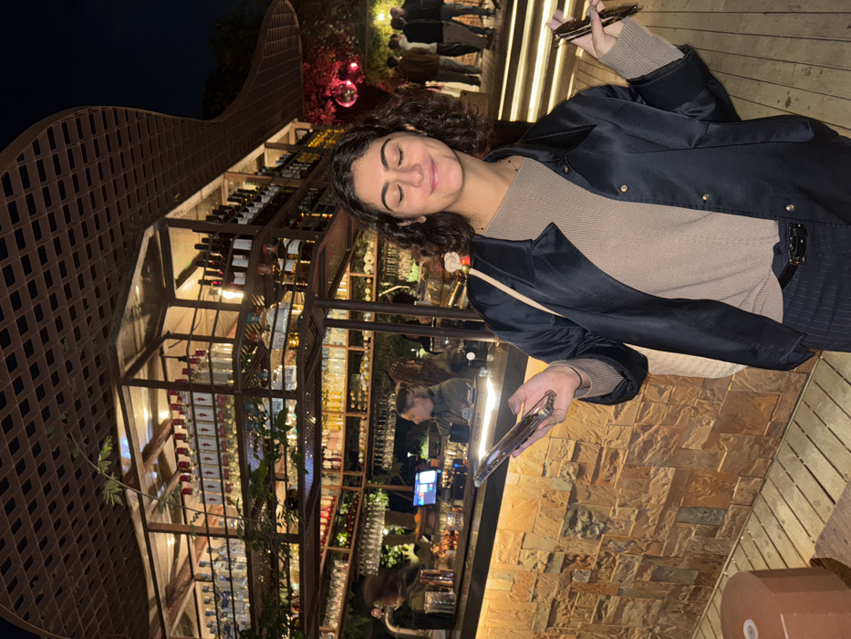 The image depicts an outdoor bar area at night, specifically the BOP Café in Porto, Portugal. In the foreground, a young woman with dark, curly hair and medium skin stands centrally, her eyes closed in a faint smile. She wears a black, open, collared jacket over a light brown long-sleeved top and dark pinstripe trousers with a belt. She holds a smartphone in her raised left hand, displaying its screen forward, and dark sunglasses in her raised right hand. A light-colored shoulder bag hangs on her left side. Behind her, a prominent multi-tiered bar structure dominates the midground. It features a dark metal framework supporting shelves densely stocked with numerous liquor bottles, including rows of clear bottles with red caps on the top tier and various wine bottles below. Inverted glassware hangs from the underside of the shelves. The structure is illuminated by warm, integrated lighting. Overhead, a distinctive dark, grid-patterned, curvilinear canopy covers the bar. The bar counter itself has a textured facade of stacked, multi-toned stone tiles (tans, browns, greys), with a dark, illuminated surface. Two individuals are visible behind the bar counter, one to the left appearing to interact with a computer screen, and another to the right. The ground is covered with light-colored wooden decking. In the far background to the right, a group of several indistinct figures stands on what appear to be wooden steps. A spherical, reflective red object, possibly a disco ball, hangs in the background. Green foliage is integrated into the bar's structure. The overall environment is illuminated by artificial warm lighting against a dark night sky.