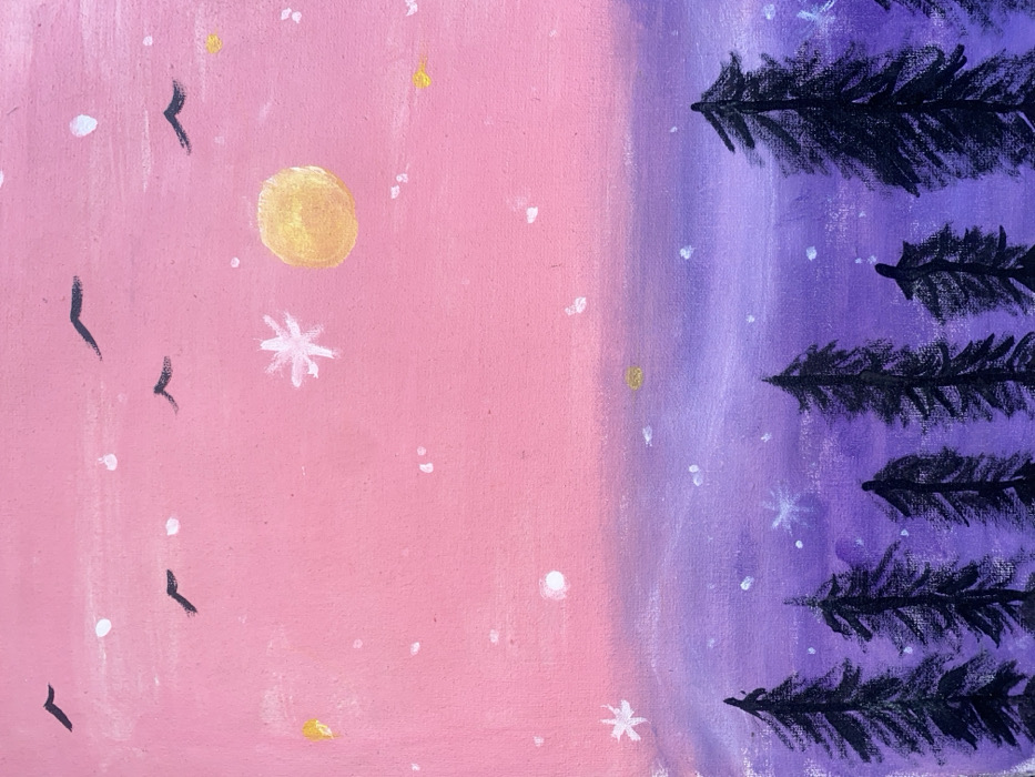 This image is a vertical painting depicting a stylized landscape, specifically located in Lekki, Nigeria. The upper portion of the canvas features a sky transitioning from a predominant pink hue at the top to a purple mid-ground. A large, yellow, circular celestial body, resembling a sun or moon, is positioned in the upper right quadrant. Several white, asterisk-shaped star forms are visible, along with numerous scattered smaller white and yellow dots representing additional stars across the sky. Multiple black, V-shaped silhouettes, consistent with birds in flight, traverse the upper pink section of the sky. The lower third of the painting depicts a dense, dark forest line composed of numerous conical evergreen trees, rendered as silhouettes against the purple sky. No people or specific human structures are visible.