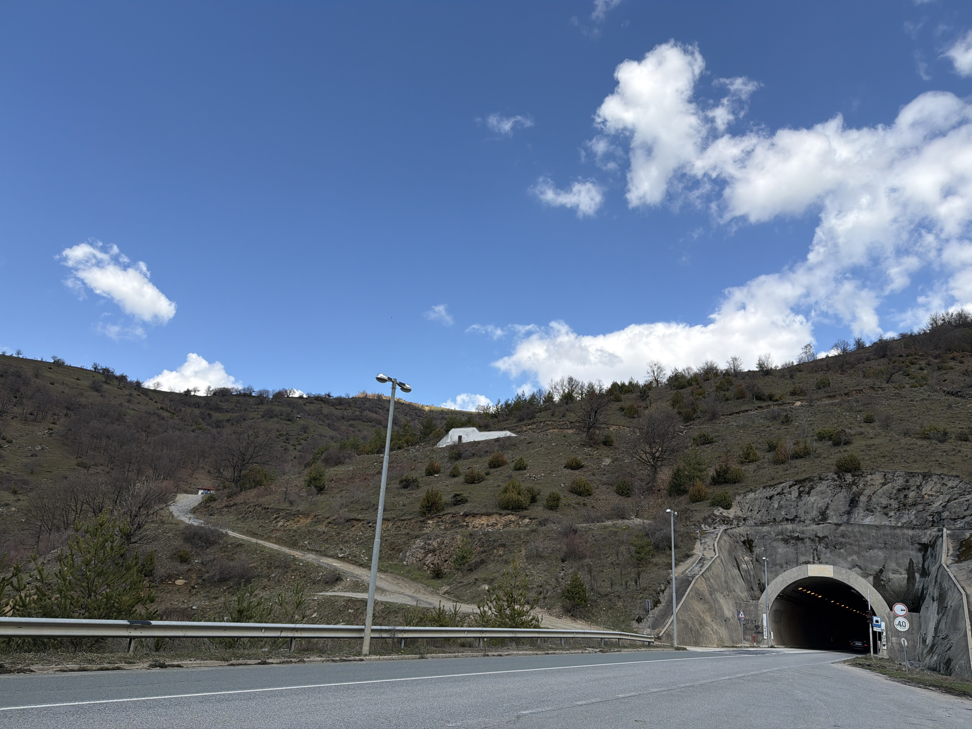 paved road leading to a tunnel entrance in Unknown, Bulgaria. The road surface is gray and appears to be well-maintained. A metal guardrail runs along the left side of the road. The tunnel entrance is constructed of gray concrete. A black car is approaching the tunnel. The surrounding landscape consists of a hillside covered with sparse vegetation and bare trees. Above the hillside is a clear blue sky with scattered white clouds. A white building is visible on the hillside. Two street lights are visible, one on each side of the road. A speed limit sign of 40 is posted to the right of the tunnel entrance.