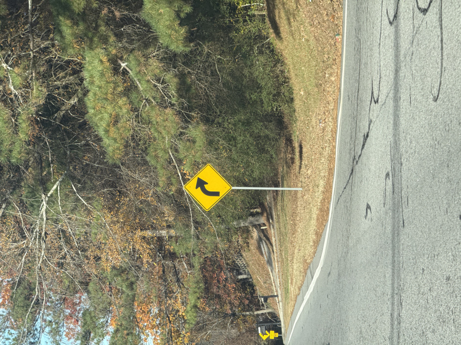 A yellow traffic sign with a left-turn arrow stands on a pole beside a road. The sign is near a forest. The road is grey with white lines, and has some cracks. The roadside is grassy, and there is a section of guardrail behind the traffic sign. The picture appears to have been rotated clockwise.