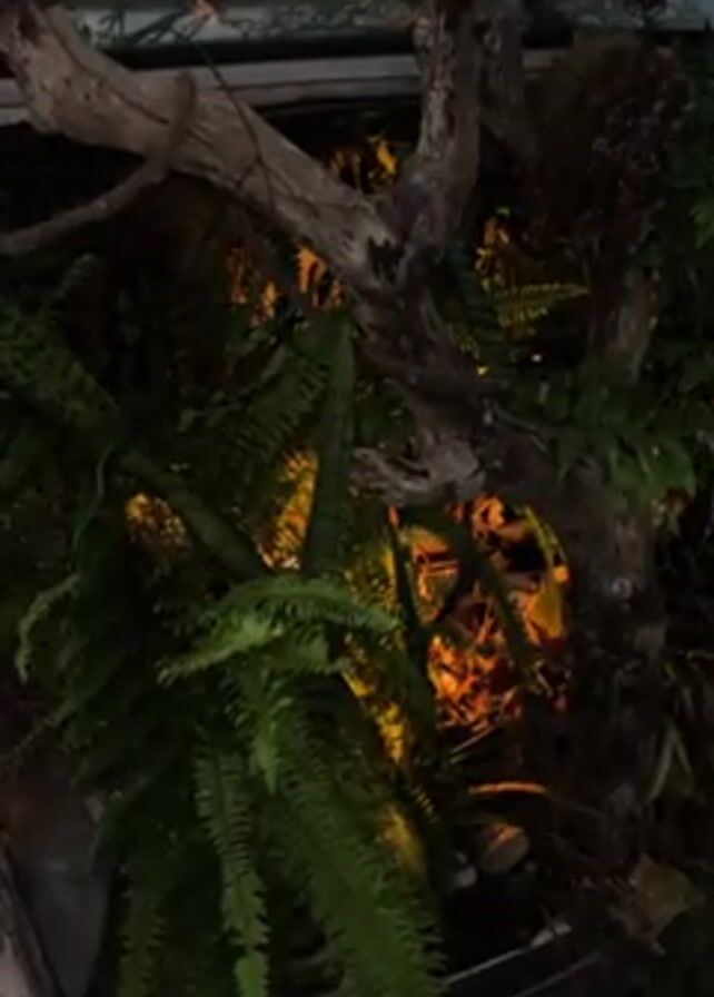dimly lit scene with an arrangement of plants and driftwood. Ferns with long, segmented fronds are prominent in the foreground, partially obscuring the view of a gnarled piece of driftwood behind them. There's an orange-yellow glow emanating from behind the driftwood and plants, creating highlights and shadows that accentuate the textures of the scene. The lighting suggests an artificial light source is being used. The background is darker, and there are sounds of people talking.