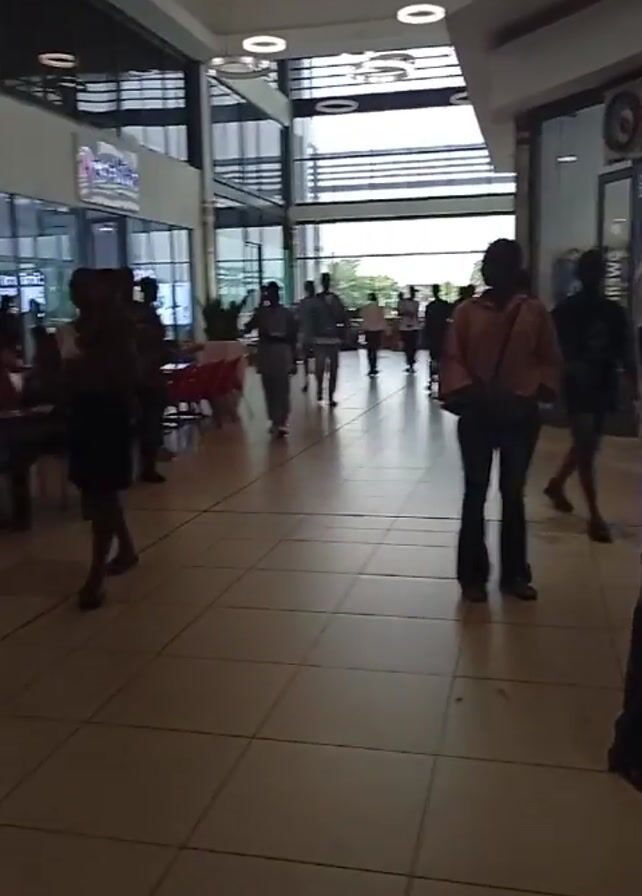 interior of a shopping mall, likely a food court area. The floor is tiled with large, light-colored squares. Overhead, there are large windows that allow natural light to illuminate the space, along with circular artificial light fixtures. Several people are visible, walking and sitting at tables. A person dressed in a skirt and brown shirt walks directly in front of the camera, carrying something pink and round. Behind them, there are tables and chairs where people are sitting and eating. A "Country Style" restaurant is seen in the background. The overall impression is of a typical shopping mall environment with people engaging in various activities.