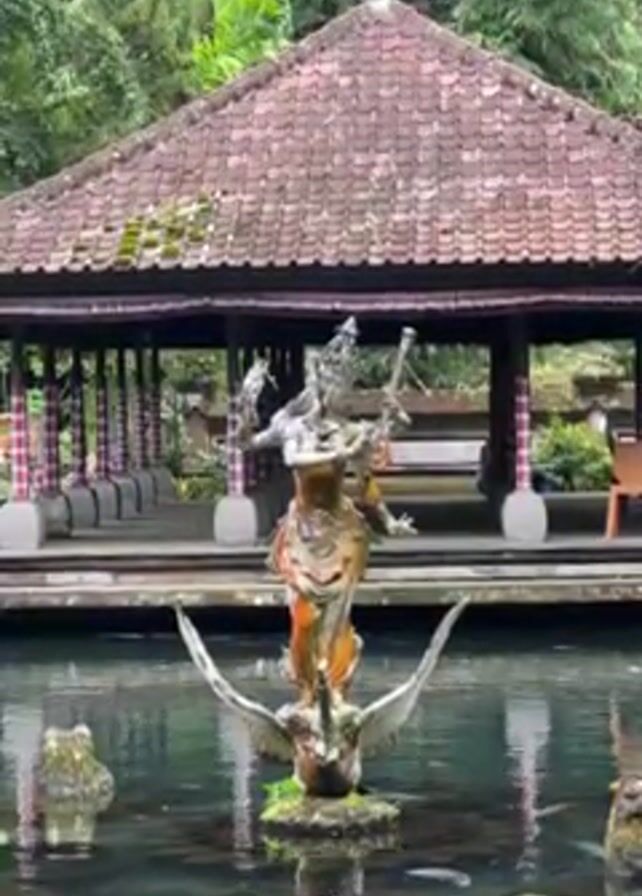 statue in Bali, Indonesia. The statue depicts a four-armed figure with a musical instrument, standing on a bird. The statue is in the middle of a pond with other small statues visible in the water. A covered structure is in the background with pillars and a tiled roof. Trees surround the area, and the sound of a rooster crowing can be heard.