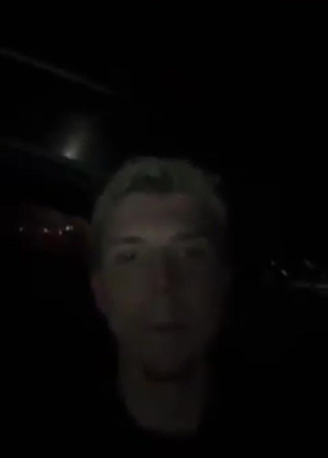A person with short, light blonde hair is looking directly at the camera in a dark setting. The person is wearing a black shirt. The person briefly moves their hand to their forehead. The lighting is poor. A red car is barely visible in the background.