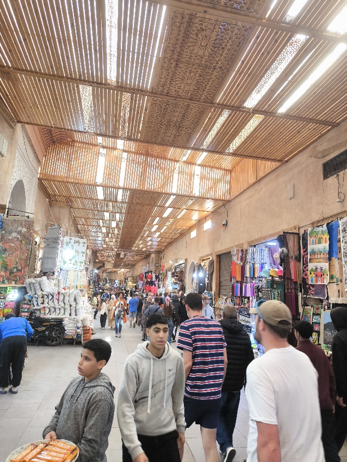 The image displays a bustling, covered market alleyway, identified as a souk in Marrakesh, Morocco