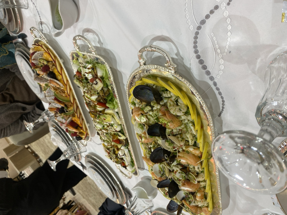 Three silver platters hold gourmet culinary creations. The first platter contains a mix of fruits like mango, dragon fruit, and berries. The second platter is filled with a green salad with a balsamic glaze, topped with mushrooms and tomatoes. The third platter presents seafood featuring mussels, clams, shrimp, and salmon with lemon slices. All are on a white tablecloth with decorative gray lines. Glasses and plates surround the platters.