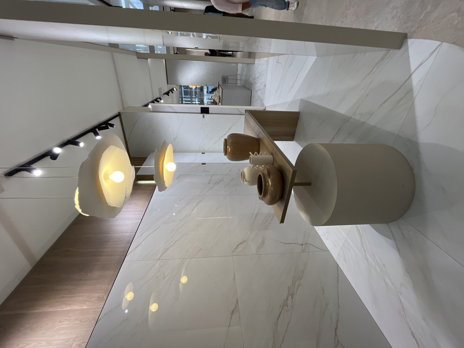 The image displays a modern interior space, likely a showroom or exhibition booth, characterized by minimalist design and material focus. The specific location in Bologna, Italy, is not discernible from the image, but the setting strongly suggests an international trade fair, possibly Cersaie. The flooring consists of large-format white tiles with subtle grey and light brown veining, which are highly reflective and extend up the wall on the left. A dark wood-grain panel runs horizontally along the upper section of this tiled wall. The white ceiling features a black track lighting system with several spotlights and two organic-shaped, ruffled white pendant lights, each emitting a warm yellow glow from an exposed bulb. In the lower-center, a contemporary display unit is present. It comprises a cylindrical beige pedestal base connected by a thin, vertical gold-colored rod to a light wood-colored rectangular shelf. Arranged on this shelf are four ceramic or earthenware vessels in various natural tones: a wide, low-necked brown pot, a taller off-white pot, and two smaller off-white vessels, one resembling a pitcher. To the right, the space opens into an adjacent area via a corridor defined by light-colored vertical partitions. In the mid-ground and background, several individuals are partially visible, suggesting an active public environment. On the far right, the lower torso and legs of a person wearing light-colored trousers and a light pink shirt are seen, facing away. Further in the background, a white counter with two grey bar stools is discernible, with blurred figures standing or seated nearby. The flooring in these background areas maintains the consistent tiled aesthetic. No specific actions or direct interactions among individuals are clearly depicted, only general presence within the space.