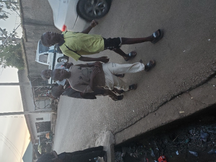 A group of children stand on a paved road next to a curb and a ditch filled with debris. A child in a yellow shirt and dark shorts extends an arm upwards towards a white car. Another child wears a light-colored shirt and pants. Several other children are clustered behind them. Buildings are visible in the background.