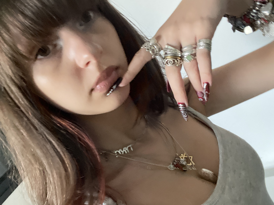 A young female subject is depicted in a close-up, angled shot, looking directly into the camera. She has long, dark brown hair with reddish highlights and bangs. Her lips are glossy, featuring a line of small, light-colored studs along the lower lip. Her right index finger is touching her lower lip. She is wearing a light gray ribbed tank top. Multiple layered silver-tone necklaces are visible, including one with a Star of David pendant incorporating red gemstones, and another with a "love" script pendant. Her right hand displays numerous silver-tone rings of varied designs, some set with stones, and a multi-charm bracelet on her wrist. Her fingernails are long, pointed, and decorated; the right index finger has a black and white spiral design, while other visible nails have dark red or black bases with embellishments. The background is uniformly light-colored, indicating an indoor environment. This scene takes place in the city of Raanana, Israel.