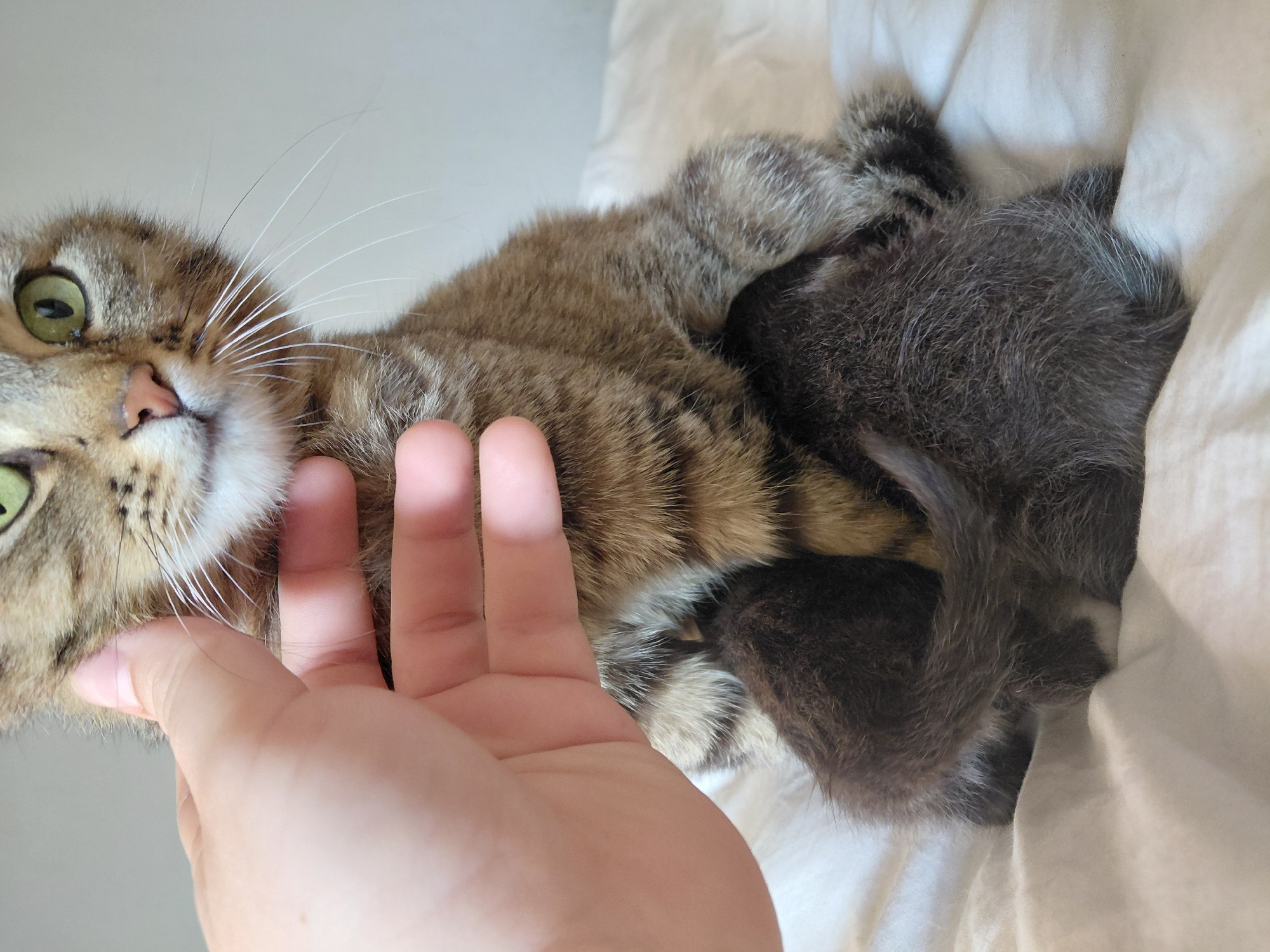 A close-up shot captures a light brown tabby cat with green eyes and white whiskers, partially obscured by a human hand stroking its face. Next to the tabby cat is a small, gray kitten nestled in white bedding. The scene is indoors, likely on a bed or similar surface. There is no indication that this image was taken in Loznitsa, Bulgaria.
