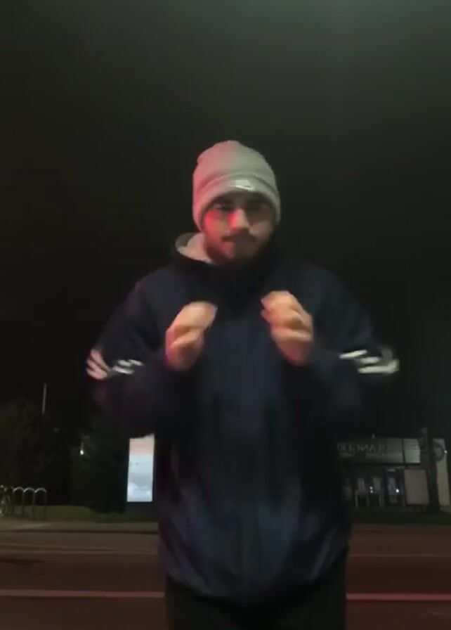 A man wearing a beanie, a dark blue jacket with white stripes on the sleeves, and black pants is standing outside at night. He is making boxing motions with his hands. There is a building with bright lights across the street and a street with bike racks on the left. The general scene is dimly lit. The man moves slightly during the video. Loud music plays in the background.