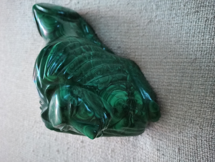 A polished, dark green carving of a lion's head, likely crafted from malachite due to its distinct banded patterns and vibrant coloration, is depicted in a close-up, high-angle view within Florenville, Belgium. The object features intricately carved details, including the lion's stylized mane, a prominent snout, and closed eyes. It rests on a light gray, textured fabric surface, which may be upholstery or carpeting. Specular reflections from an unseen light source are visible on the carving's glossy finish. No individuals or additional environmental elements are present in the immediate scene.