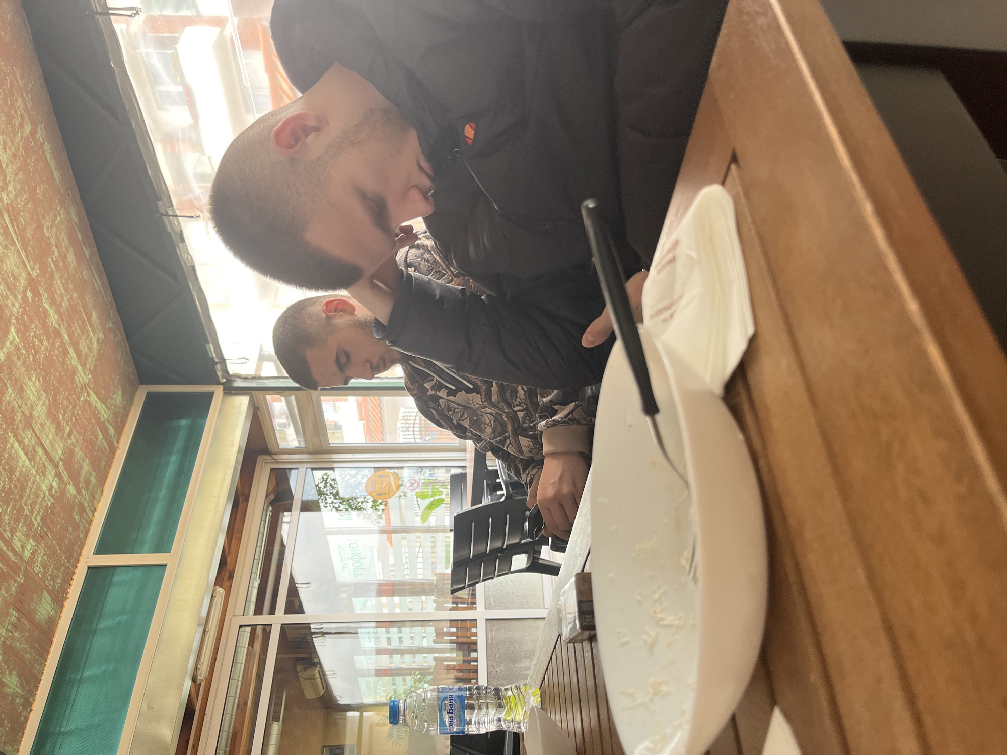 Two young men are seated at a wooden table inside a restaurant. One man is wearing a black jacket, and the other is wearing a camouflage pattern jacket. On the table, there is a half-eaten meal in a white bowl, a bottle of water labeled "ОНА БАНЯ," and a fork. Through the windows, chairs, tables, and a street scene can be seen. The restaurant is located in Strazhitsa, Bulgaria.