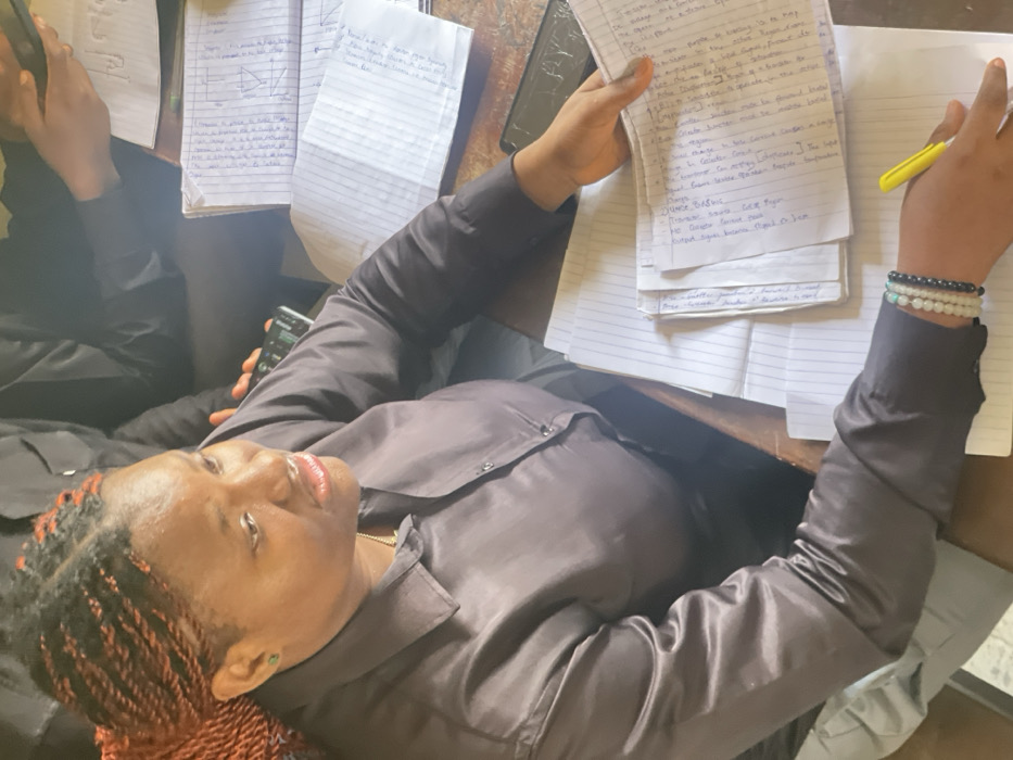 In Okigwe, Nigeria, an indoor scene displays a woman with reddish-orange braided hair, wearing a dark brown long-sleeved collared shirt, small green stud earrings, and a faint gold neck chain. Her gaze is directed towards the right side of the frame. She is seated at a dark wooden surface, likely a desk, with her right hand holding a sheet of lined paper densely covered in handwritten text. Her left hand, adorned with white, light blue, and dark grey beaded bracelets, rests near a yellow pen on another sheet of paper. Several other sheets of lined paper with handwriting, including one with geometric diagrams, are spread across the desk. In the background, partial views of other individuals are visible, including one person's hands operating a smartphone displaying a green screen interface. The overall environment appears to be a work or study setting.