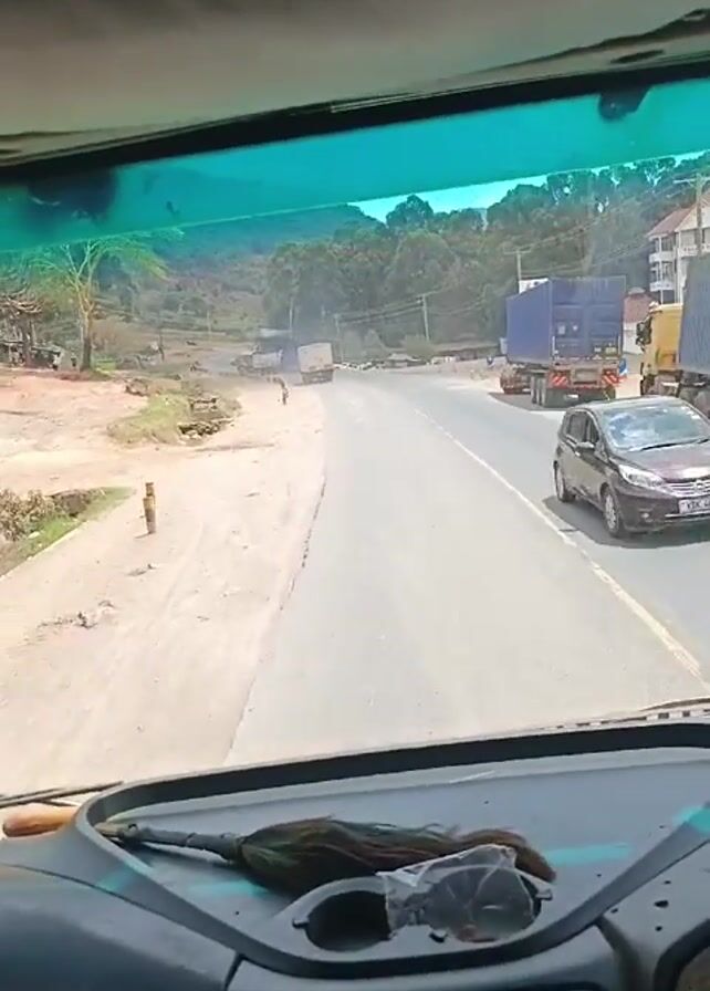 The view from inside a truck cab shows a paved road. To the right are stopped cars and a semi-truck hauling a shipping container. A gas station with an OLA sign is also visible on the right. To the left of the road is a dirt area with wooden posts. A truck kicks up dust further down the road. The windshield has a green tint. On the dashboard of the truck are sunglasses, a feathered duster, and a blue cloth.
