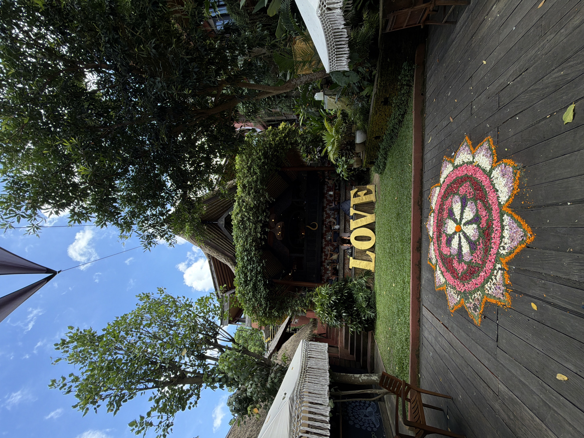 The image, taken in Peliatan, Indonesia, depicts an outdoor area featuring a wooden deck on which a large, circular floral arrangement is displayed. Adjacent to the deck is a patch of grass where the gold, block letter "LOVE" stands. Beyond the grass, a building with a thatched roof covered in climbing vines can be seen. The sky, visible through trees, is blue with scattered clouds. A white canopy is partially visible in the lower left and upper right corners. A wooden chair sits on the deck near the floral arrangement.
